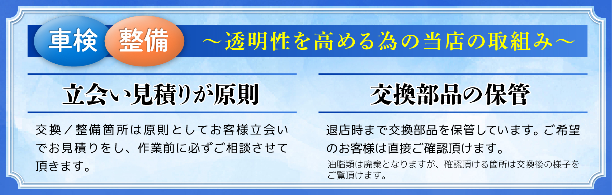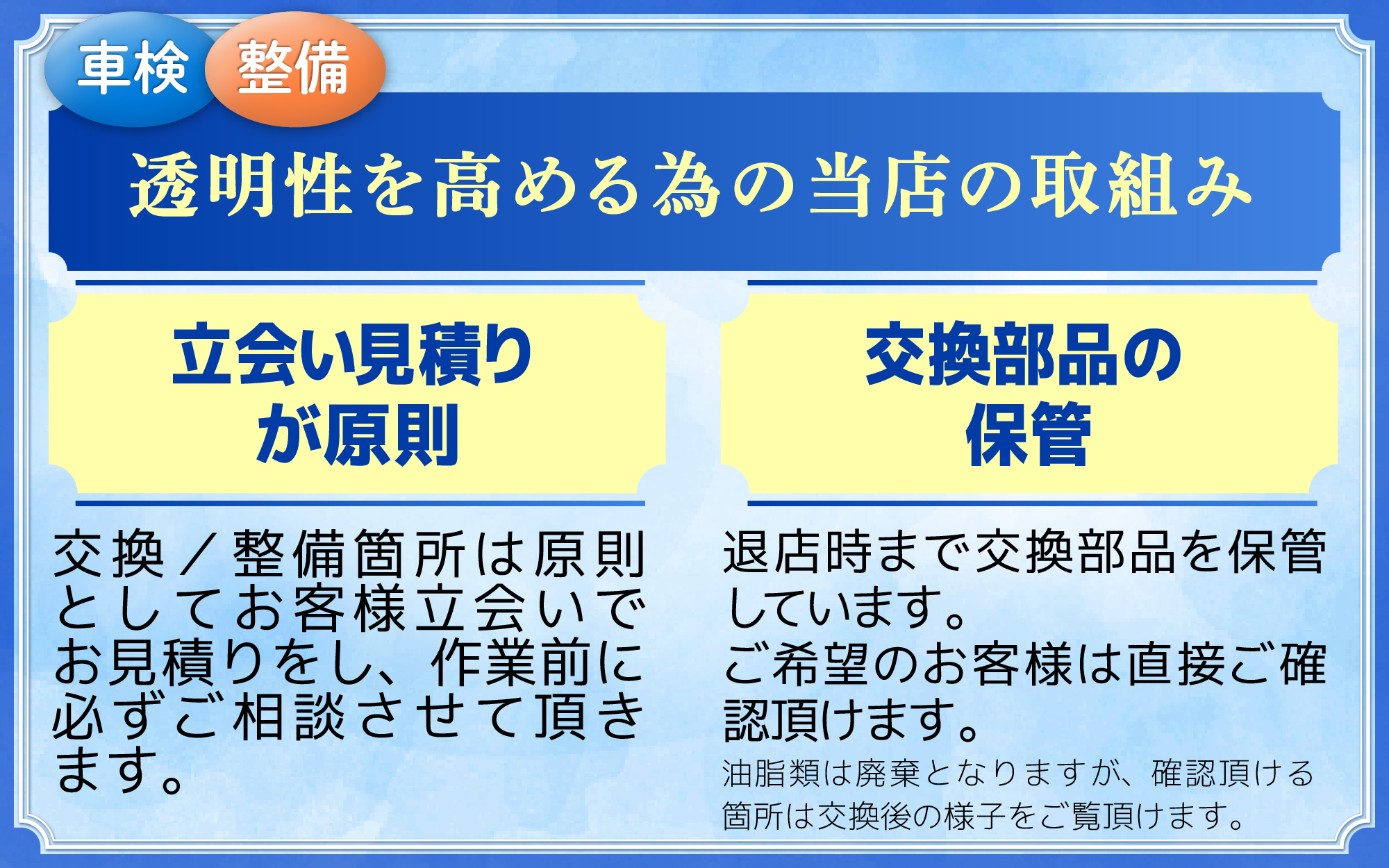 実車を見て確認した後、待合室で見積りの話を伺いました。先ほど指摘された事柄が見積り書に計上されていました。絶対に変えないと車検に通らない部分と、変えた方が良い部分についての説明がありました。予算や優先度を勘案して交換をお願いする物と今回は見送る物をスタッフさんにお伝えしましたところ、見送るといった物については、無理に勧めてくることもされなかったので良かったです。